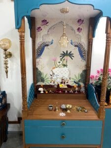 If your mandir has LED lights, choose slightly soft-toned wallpaper to avoid over-brightness.