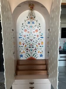 If your mandir unit is less than 3 feet wide, choose a centred portrait design instead of full mural for better clarity.