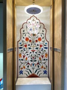 Modern homes, especially apartments in Pune, have compact yet beautifully designed mandir units inside the living room. Instead of tiles or plain paint, homeowners now prefer: